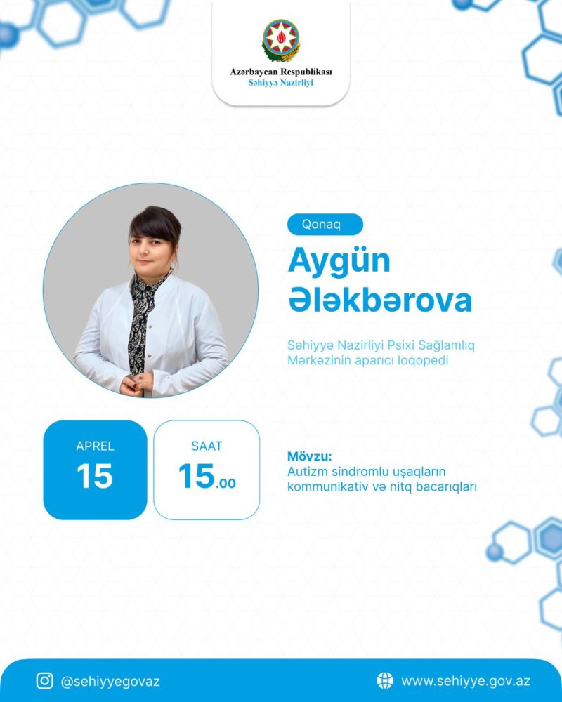 Bu gün Səhiyyə Nazirliyinin rəsmi “İnstagram” səhifəsində növbəti canlı yayım yayımımız autizm sindromlu uşaqların kommunikativ və nitq bacarıqları haqqında olacaq.