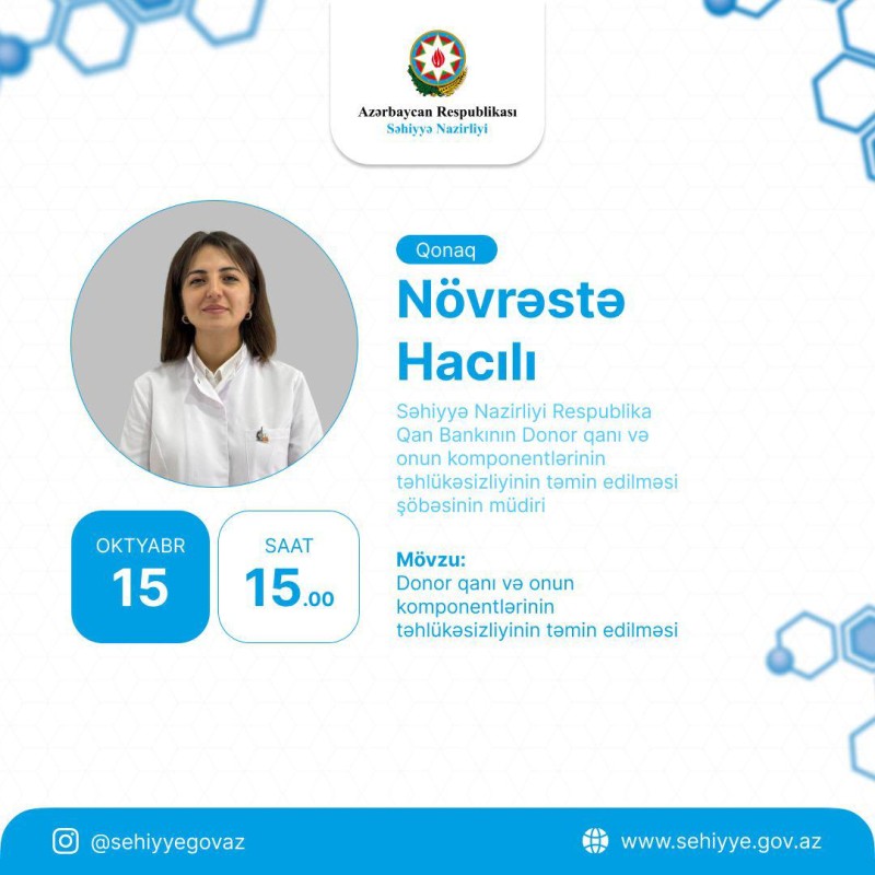 Bakıvaxtı.az xəbər verir ki, canlı yayımın qonağı Səhiyyə Nazirliyi Respublika Qan Bankının Donor qanı və onun komponentlərinin təhlükəsizliyinin təmin edilməsi şöbəsinin müdiri, həkim-laborantı Növrəstə Hacılıdır.