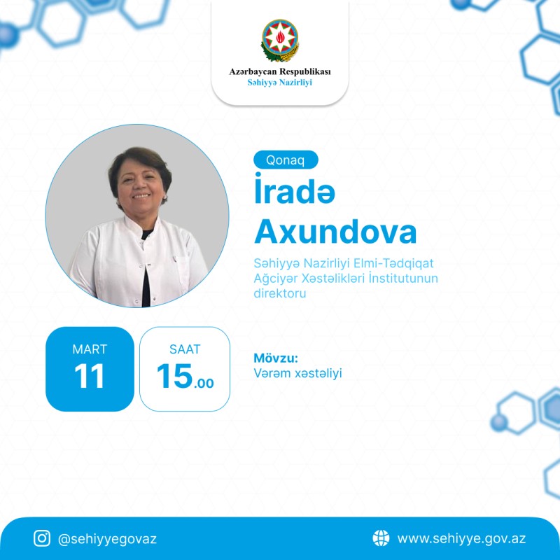 Bakıvaxtı.az xəbər verir ki, canlı yayımın qonağı Səhiyyə Nazirliyi Elmi-Tədqiqat Ağciyər Xəstəlikləri İnstitutunun direktoru İradə Axundovadır.