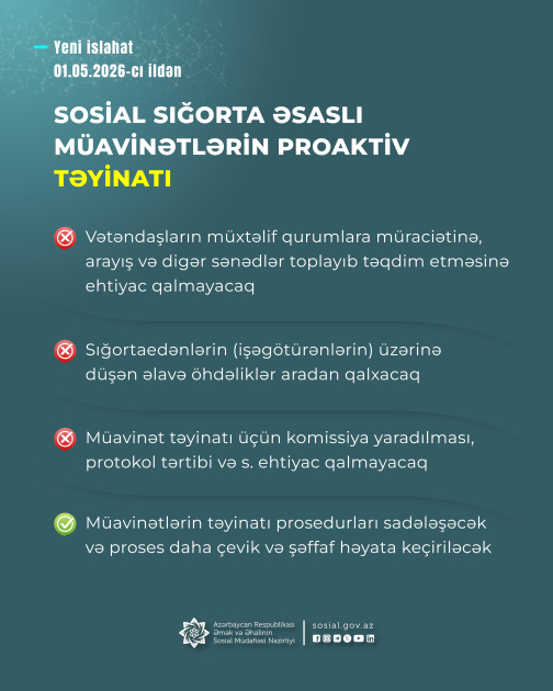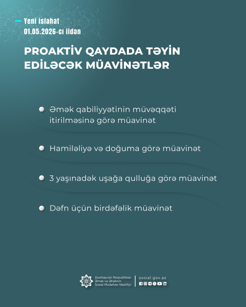 Əmək və Əhalinin Sosial Müdafiəsi Nazirliyinin İctimaiyyətlə əlaqələr şöbəsindən Bakıvaxtı.az-a verilən məlumata görə, sosial sığorta əsaslı olan 4 müavinət növü - əmək qabiliyyətinin müvəqqəti itirilməsinə görə müavinət, hamiləliyə və doğuma görə müavinət, 3 yaşınadək uşağa qulluğa görə müavinət və dəfn üçün birdəfəlik müavinət bu il mayın 1-dən avtomatlaşdırılmış, proaktiv qaydada təyin ediləcək.