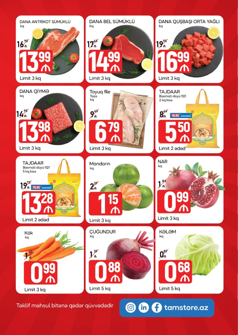 Bakıvaxtı.az-ın məlumatına görə, kampaniya zamanı təzə toyuğun 1 kilosu 4.49 manat, təzə file 6.79 manat, yerli sümüklü dana ətinin 1 kilosu 12.99 manat, yerli sümüksüz dana əti 16.99 manat, Tajdar düyü 2 kiloluq kisə 5.50 manat, Sevimli Dad kərə yağının 1 kilosu 12.98 manat, Leya günəbaxan yağı 1 litir 2.98 manat, Soğan 19 qəpik, kartof 59 qəpik olacaq. Tamstore Marketlər Şəbəkəsi bütün qızrmızı ət çeşidlərinə meyvə və tərəvəzə, təzə toyuq məhsullarına tətbiq etdiyi bazardan ucuz qiymətlər strategiyasını uzunmüddətli etməyi planlaşdırıb.