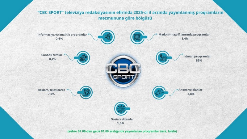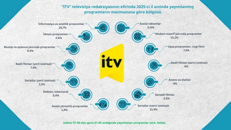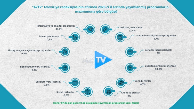 Azərbaycanda 2025-ci il üzrə ümumölkə yerüstü televiziya yayımçılarının proqramlarının janr bölgüsü açıqlanıb.