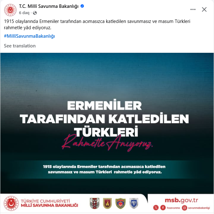 Türkiyə Müdafiə Nazirliyi (MN) 1915-ci il hadisələri ilə bağlı sosial media hesabında paylaşım edib.