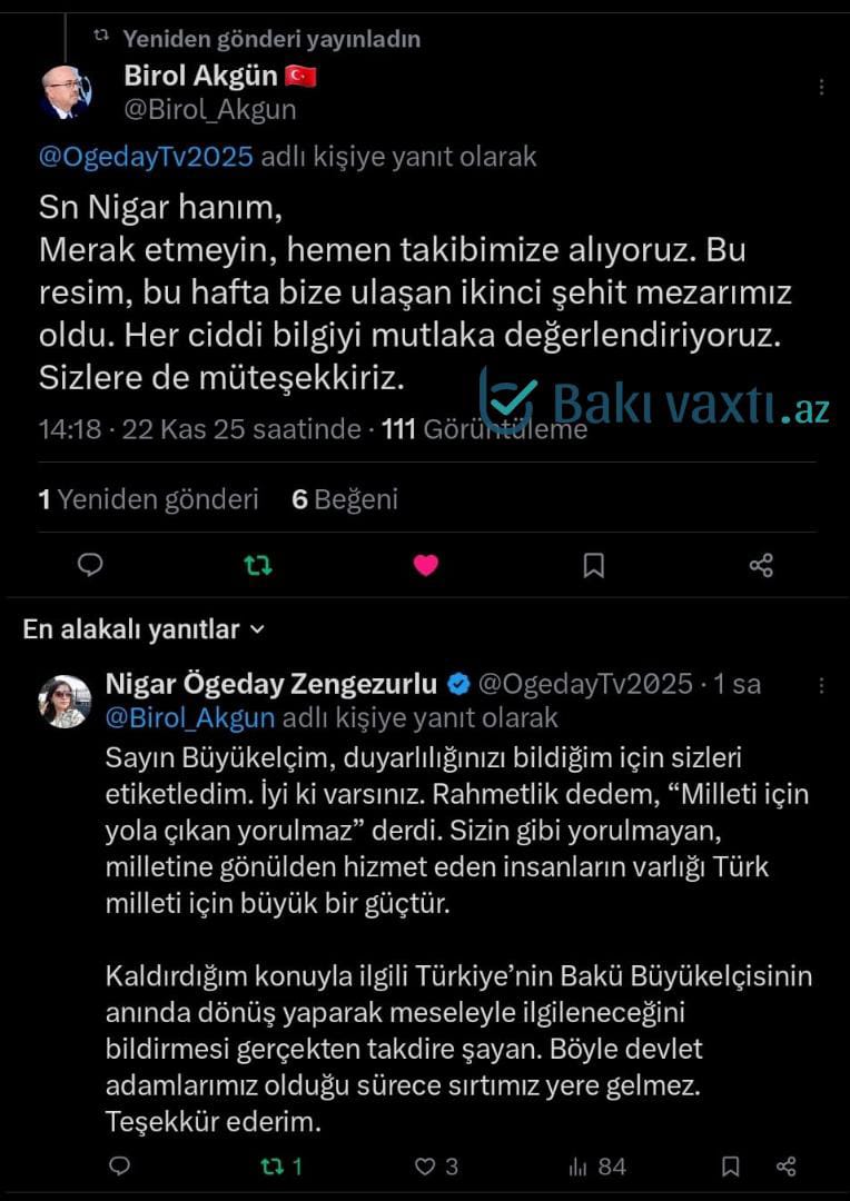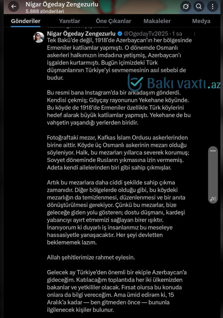 Türkiyədə yaşayan azərbaycanlı jurnalist Nigar Ögeday, X sosial şəbəkəsində bir izləyicisinin ona Göyçay rayonunun Yekəxana kəndindən göndərdiyi şəhid məzarının fotosunu paylaşaraq həm Azərbaycan, həm də Türkiyədən rəsmi şəxsləri etiketləyib.