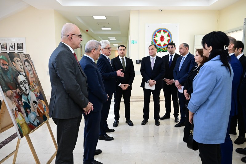 Əvvəlcə qonaqlar məktəbin foyesində şagirdlərin rəsmlərindən ibarət sərgi ilə tanış olublar.