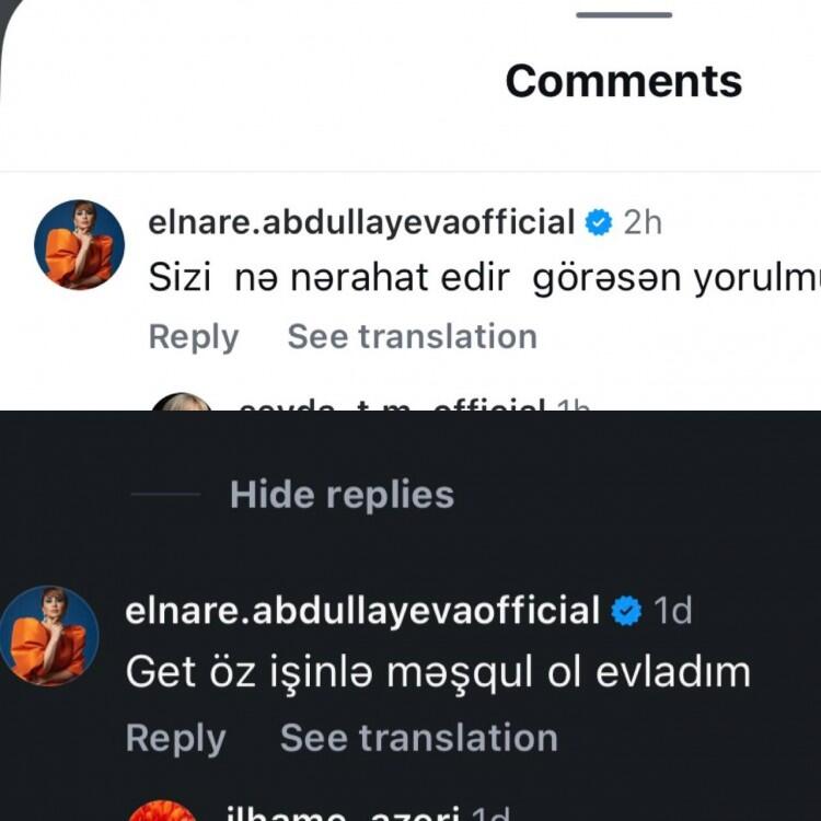 E.Abdullayeva şərh yazanlara "Sizi nə narahat edir? Yorulmursunuz? Get, öz işinlə məşğul ol" reaksiyasını verib.